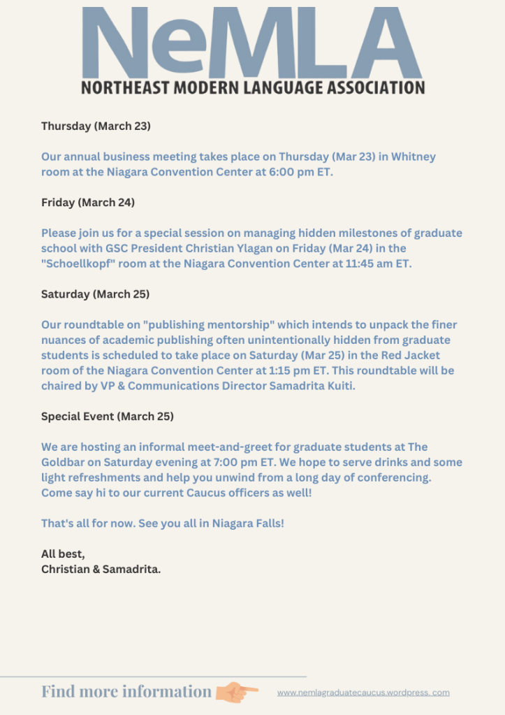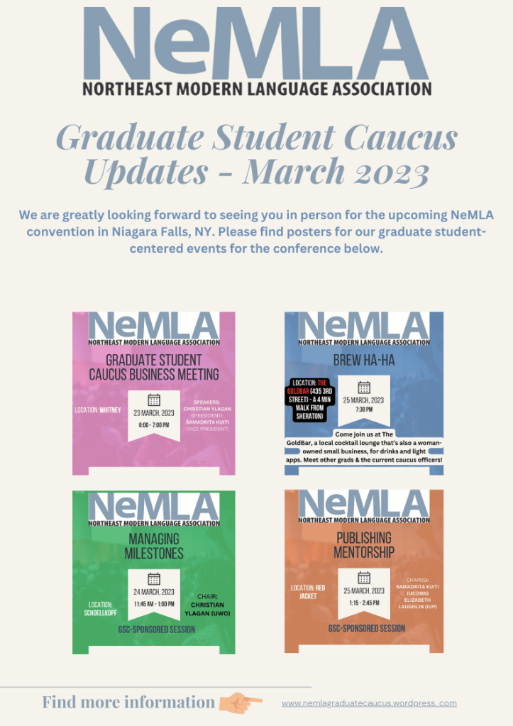Below, please find a montage of some of the posters/digital content I have created during my tenure as NeMLA Graduate Communications Fellow & the Communications Director of NeMLA Graduate Student Caucus.